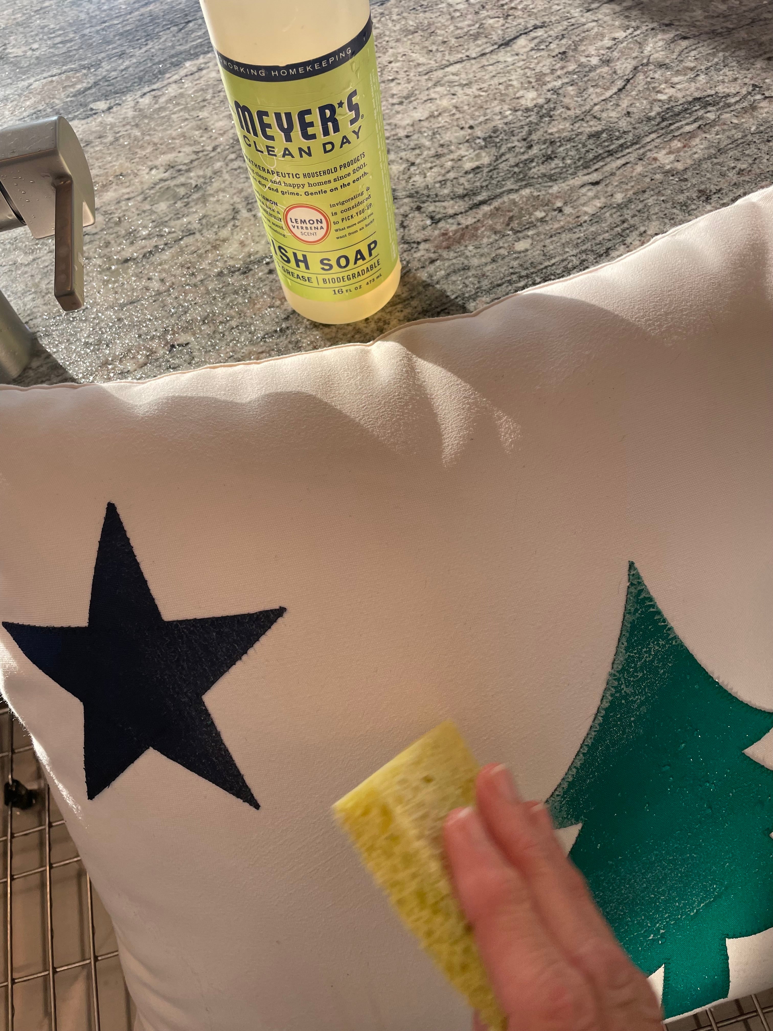 Soak fabric in a solution of ¼ cup mild soap per gallon of lukewarm water. Use a sponge or soft bristle brush to lightly agitate the spill. Then rinse thoroughly to remove all soap residue and allow fabric to air dry.