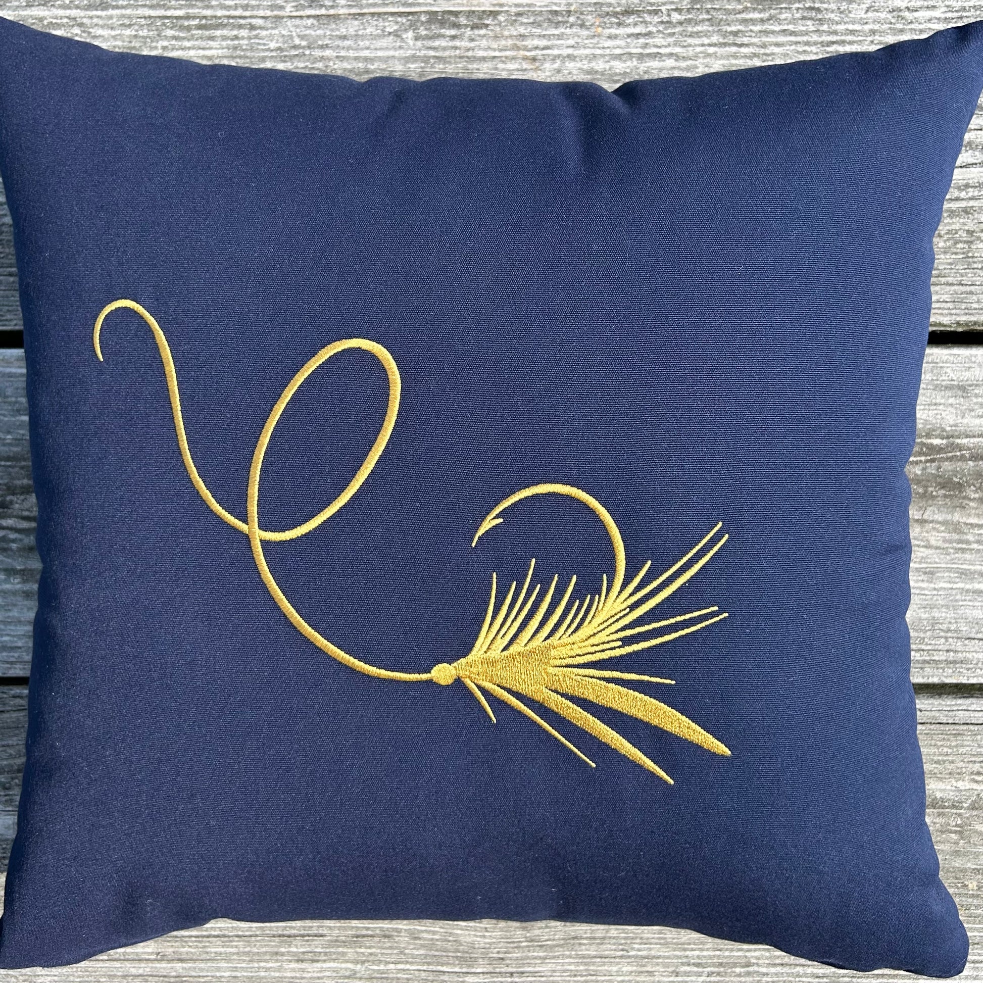 On the Fly indoor/outdoor throw pillow. Made in Maine, this nautical navy pillow is constructed with premium quality Sunbrella® fabric that is fade, stain, and weather resistant. The design is embroidered for durability and design aesthetic. Add a touch of nautical style to your deck, patio, or boat with our luxuriously comfortable pillows.