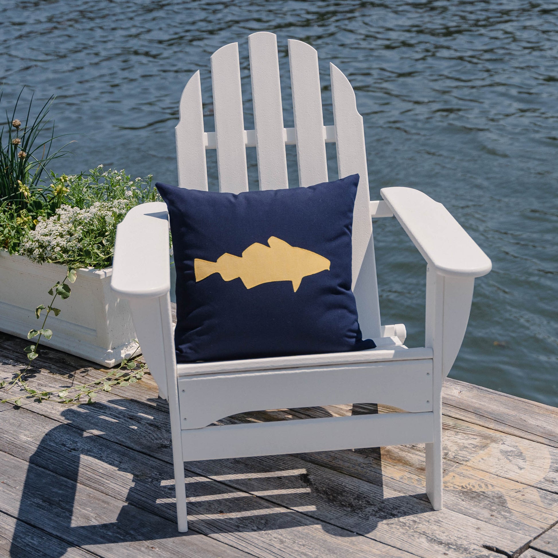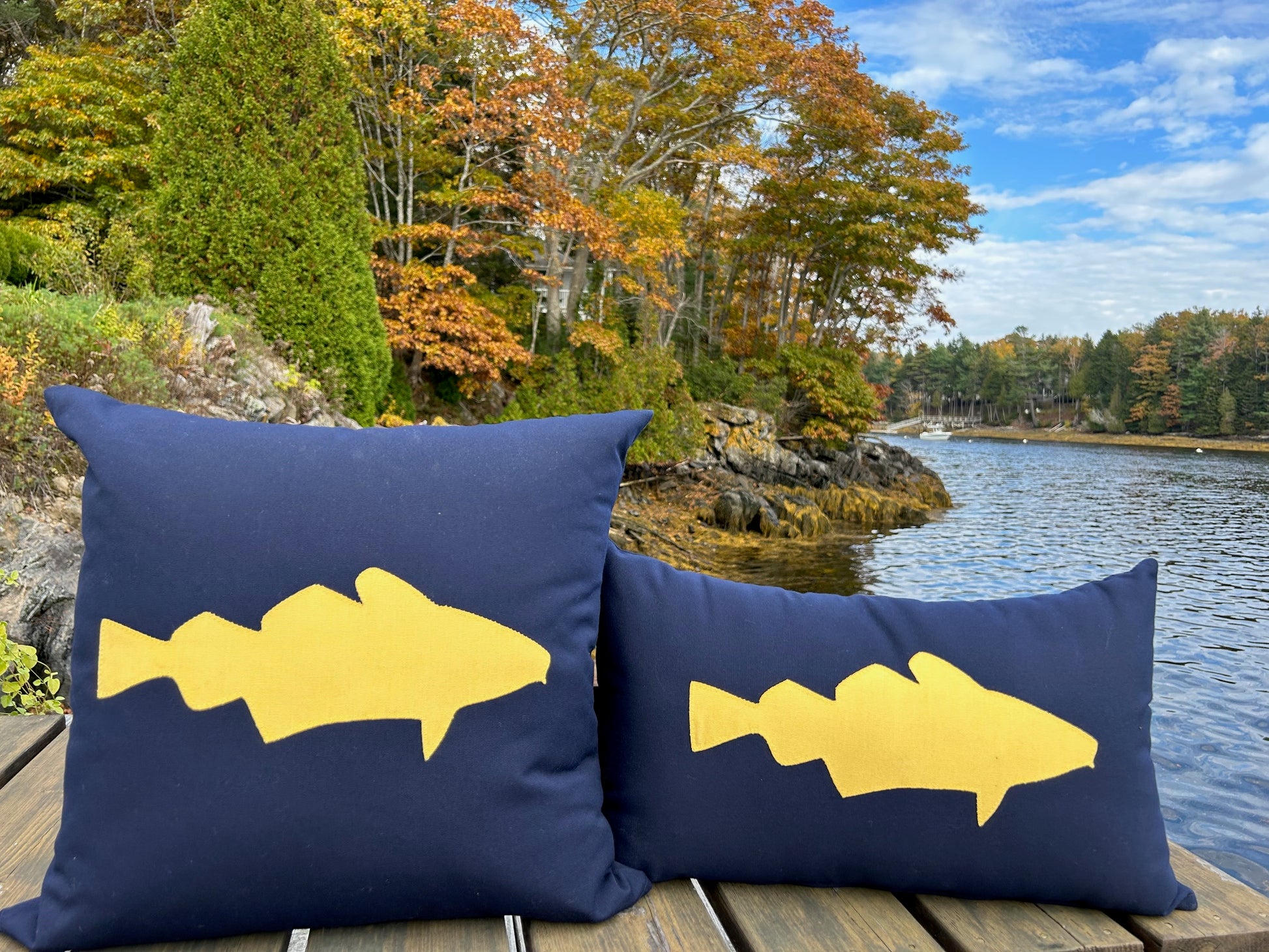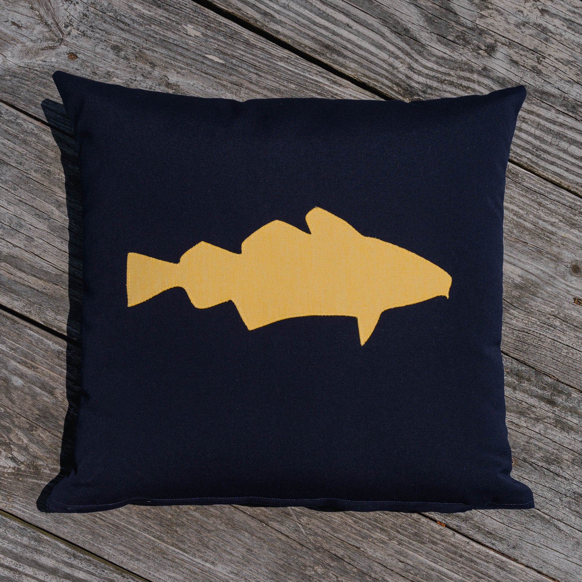 Golden cod indoor/outdoor throw pillow. Made in Maine, this nautical navy pillow is constructed with premium quality Sunbrella® fabric that is fade, stain, and weather resistant. The design is appliquéd with a nautical zig-zag stitch for durability and design aesthetic. Add a touch of nautical style to your deck, patio, or boat with our luxuriously comfortable pillows.