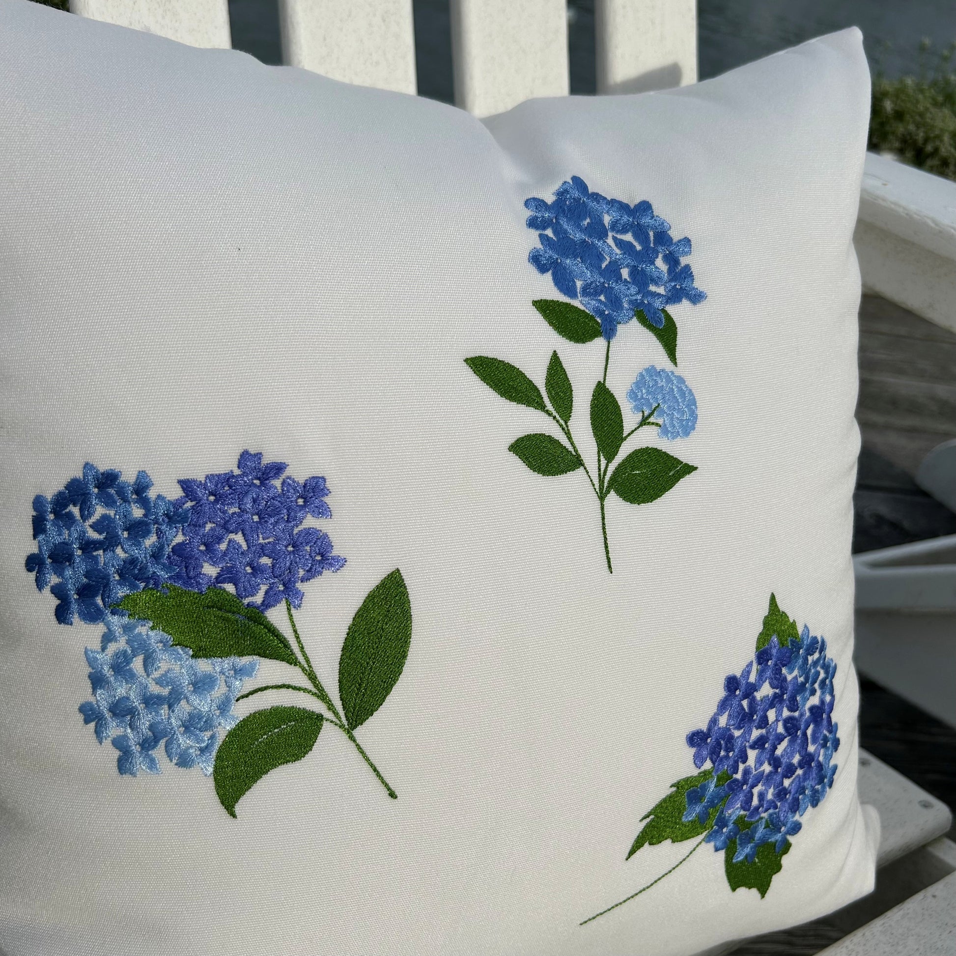Inspired by the costal gardens of Maine, each pillow features a unique hydrangea embroidered design stitched onto durable, weather-resistant Sunbrella (R) fabric. Perfect for porches, patios or boat decks, this hydrangea outdoor pillow combines comfort, artistry and lasting quality. No two pillows are alike, making each piece a special accent for your home or a thoughtful gift for all that love costal living and floral design!