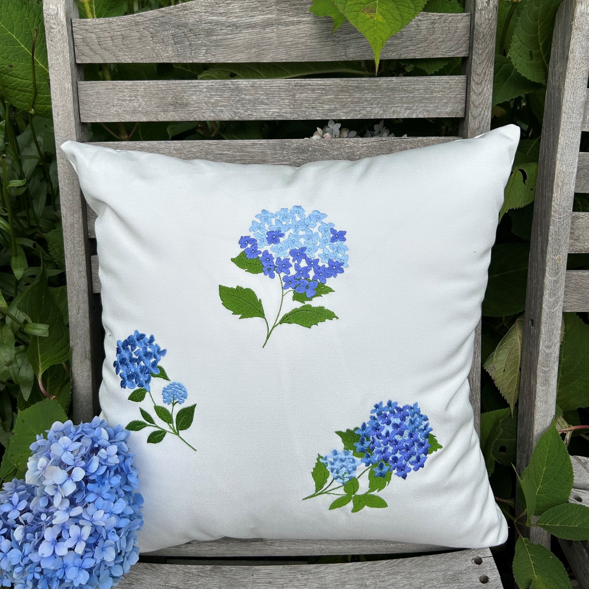 Inspired by the costal gardens of Maine, each pillow features a unique hydrangea embroidered design stitched onto durable, weather-resistant Sunbrella (R) fabric. Perfect for porches, patios or boat decks, this hydrangea outdoor pillow combines comfort, artistry and lasting quality. No two pillows are alike, making each piece a special accent for your home or a thoughtful gift for all that love costal living and floral design!