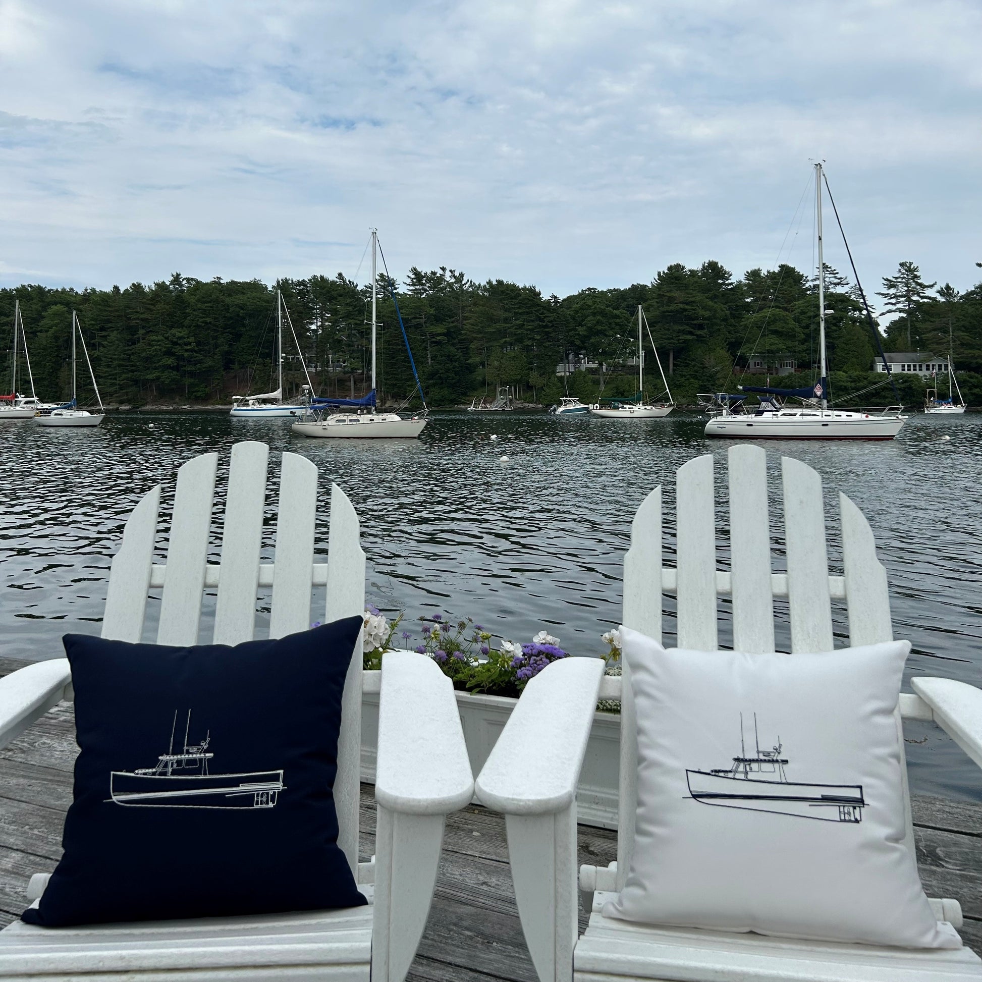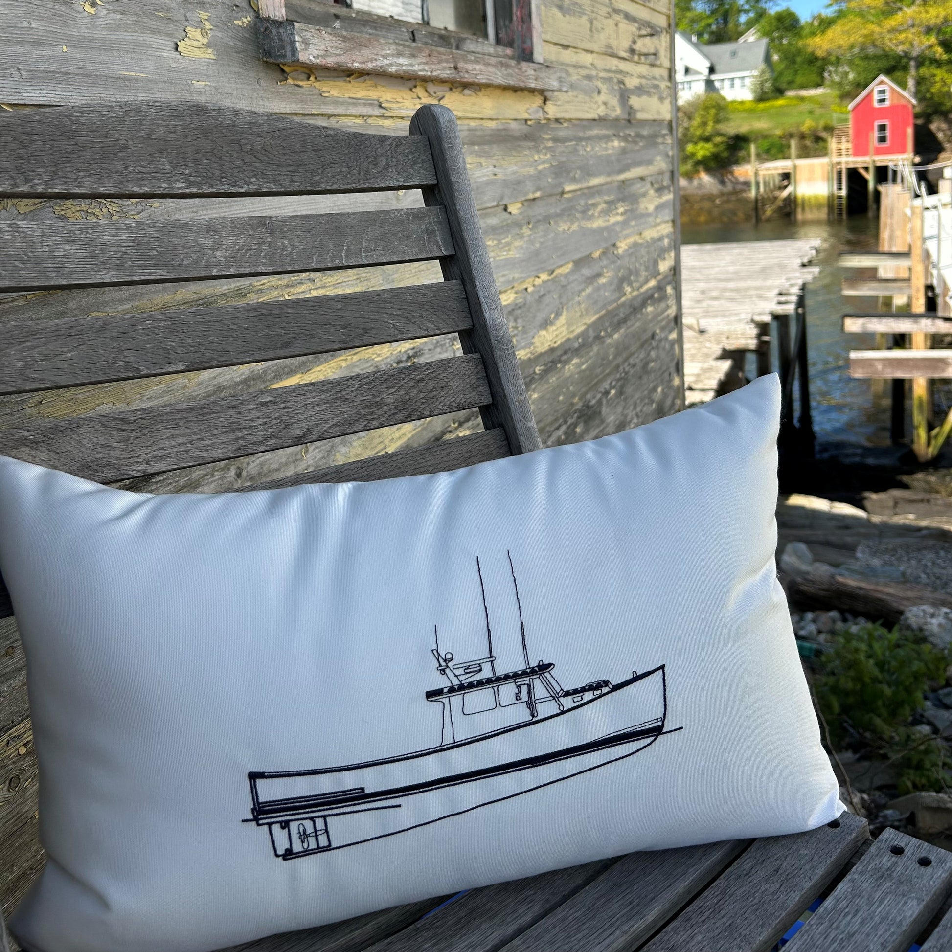 Lobster boat line embroidery indoor/outdoor throw pillow. Made in Maine, this pillow, available in nautical navy and natural white is constructed with premium quality Sunbrella® fabric that is fade, stain, and weather resistant. The design is embroidered for durability and design aesthetic. Add a touch of nautical style to your deck, patio, or boat with our luxuriously comfortable pillows.