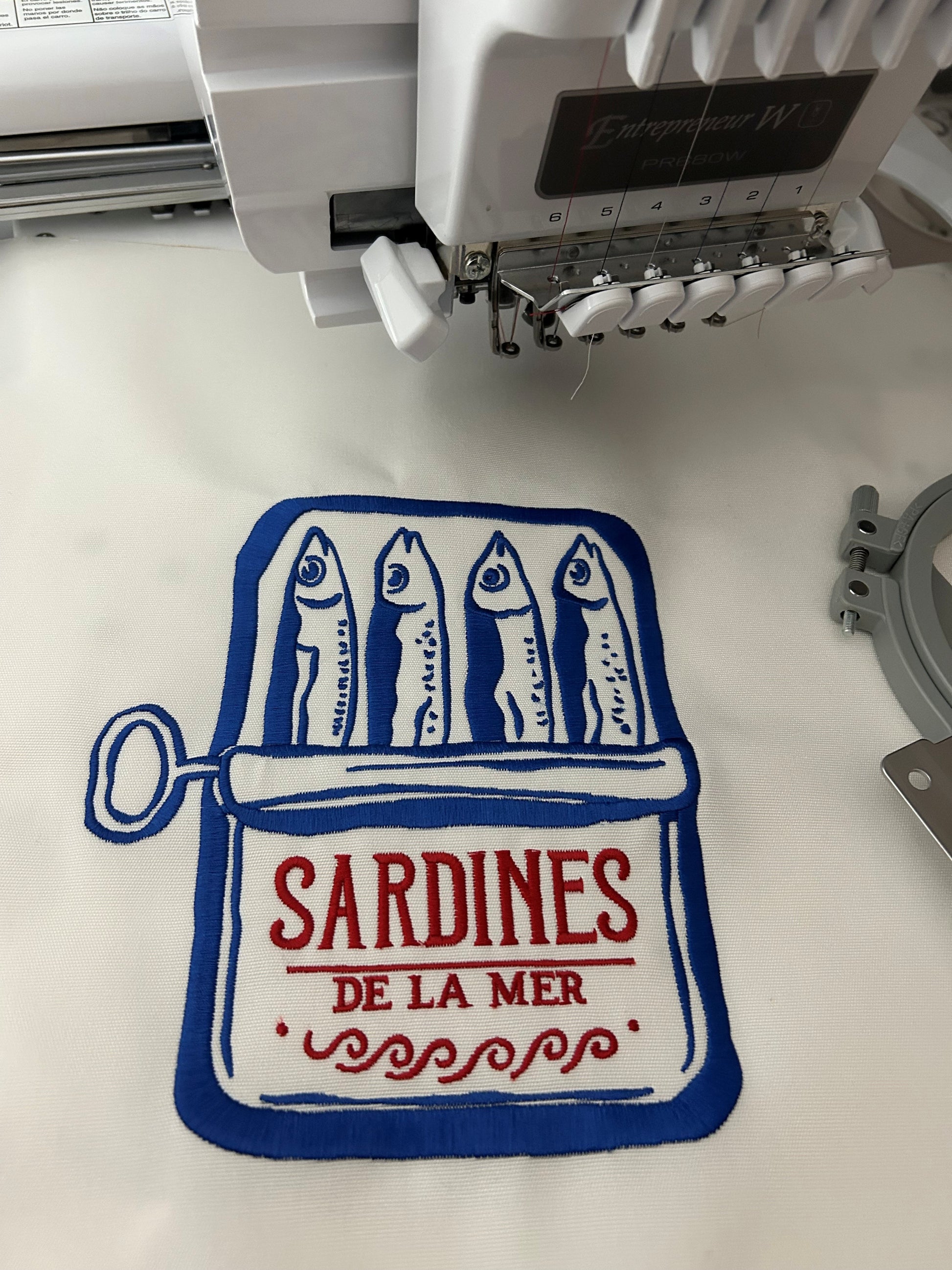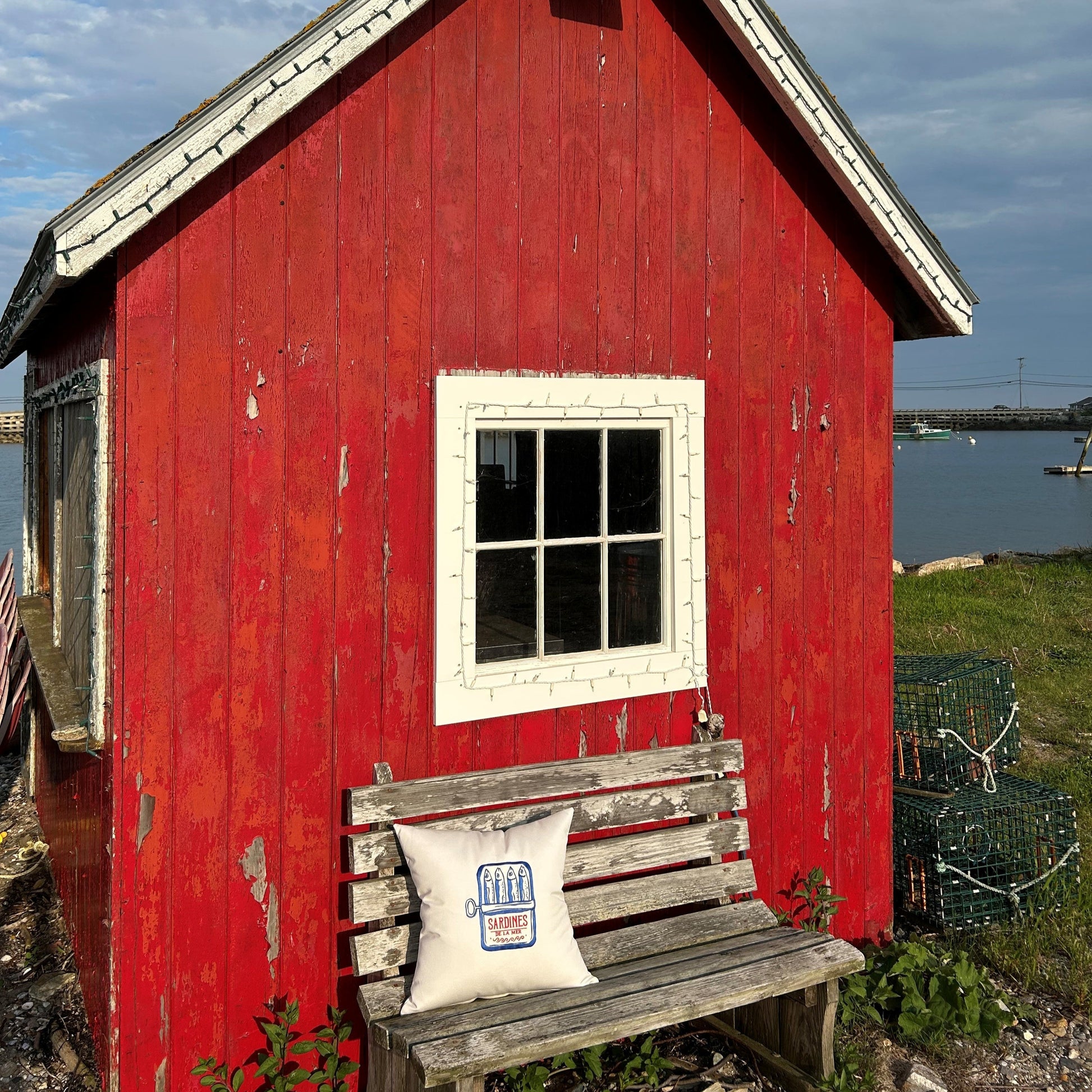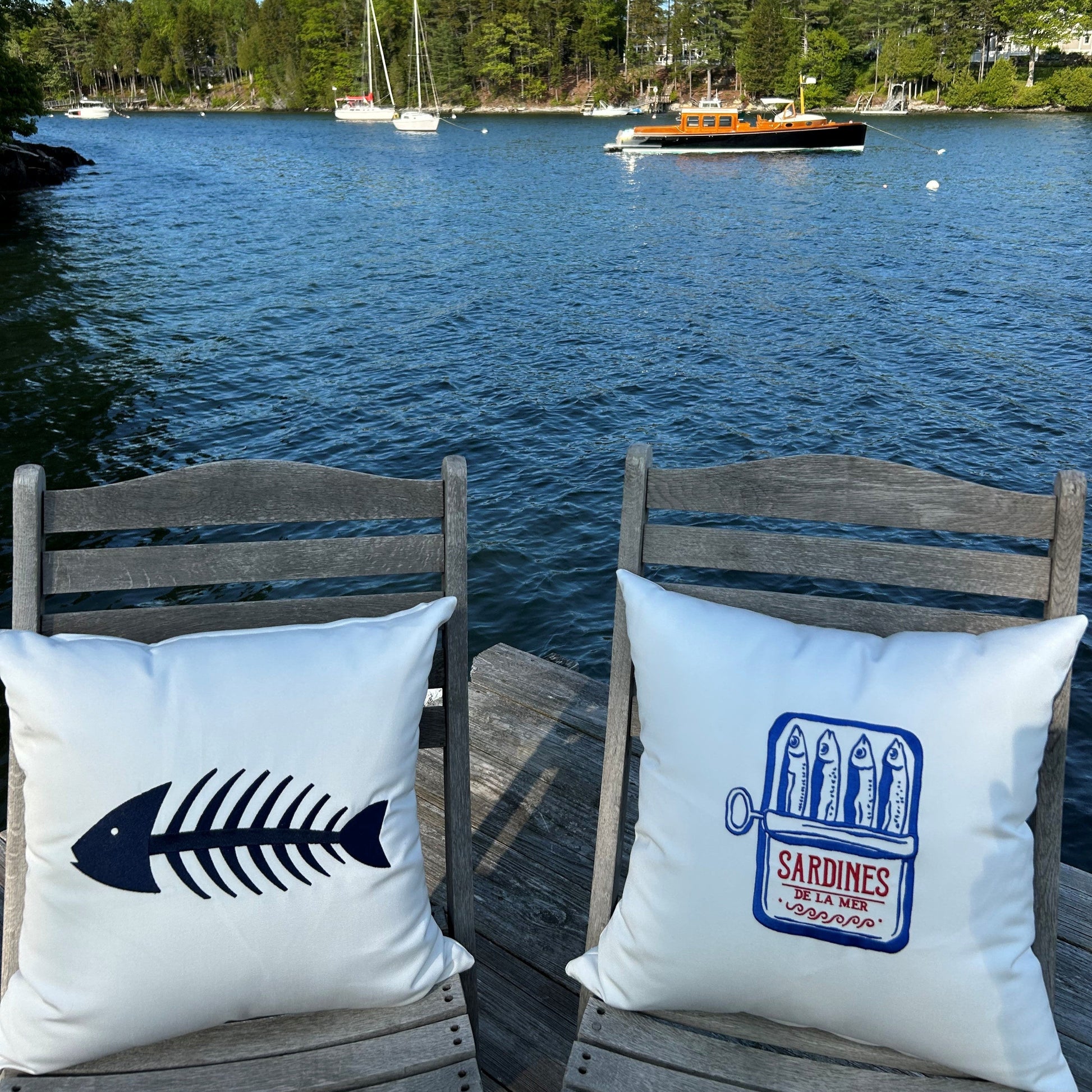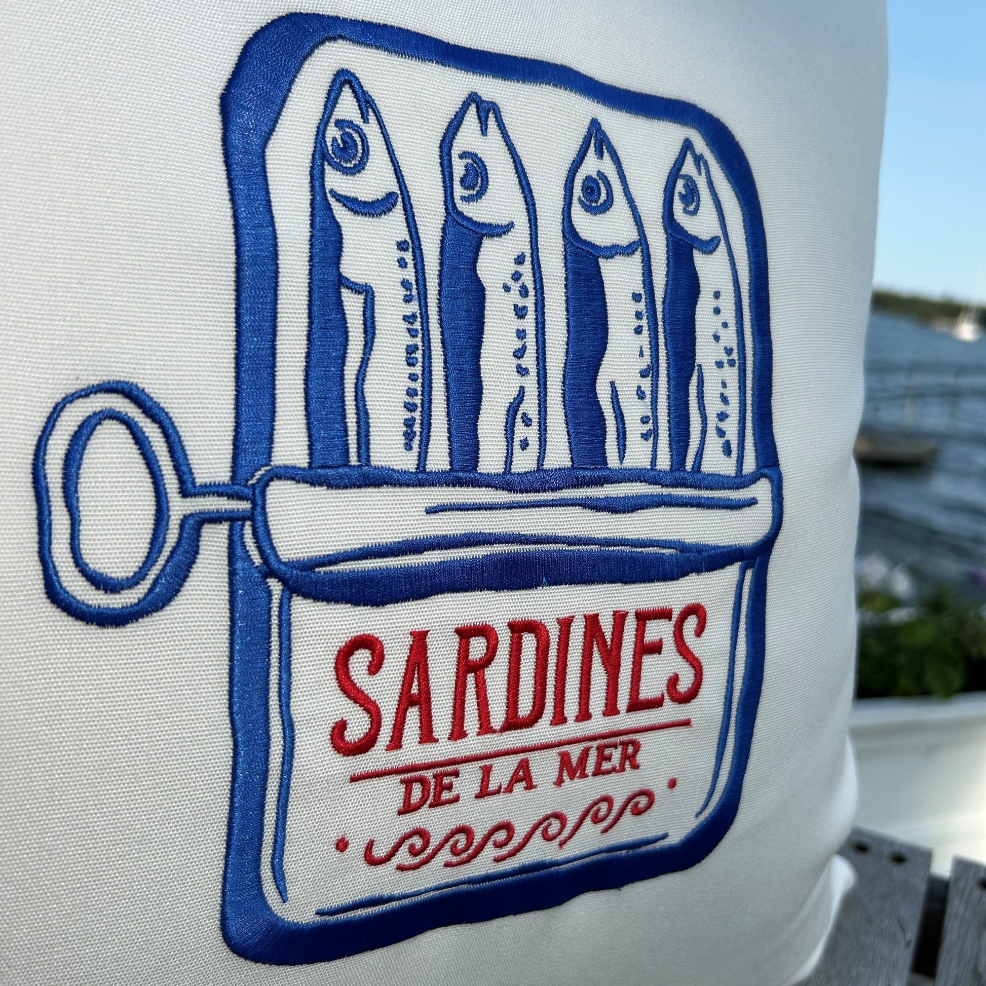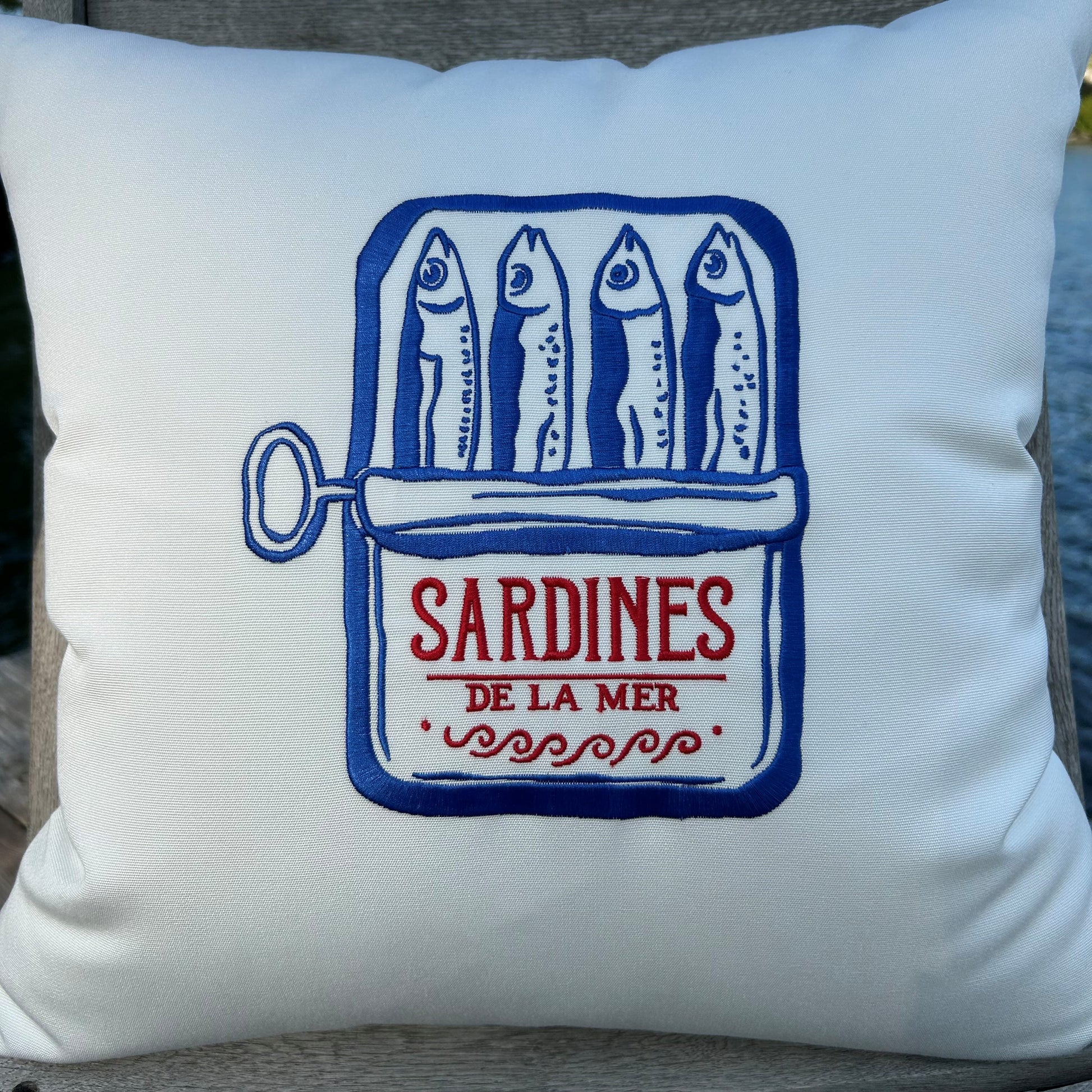 Sardines indoor/outdoor throw pillow. Made in Maine, this natural white pillow is constructed with premium quality Sunbrella® fabric that is fade, stain, and weather resistant. The design is embroidered for durability and design aesthetic. Add a touch of nautical style to your deck, patio, or boat with our luxuriously comfortable pillows.