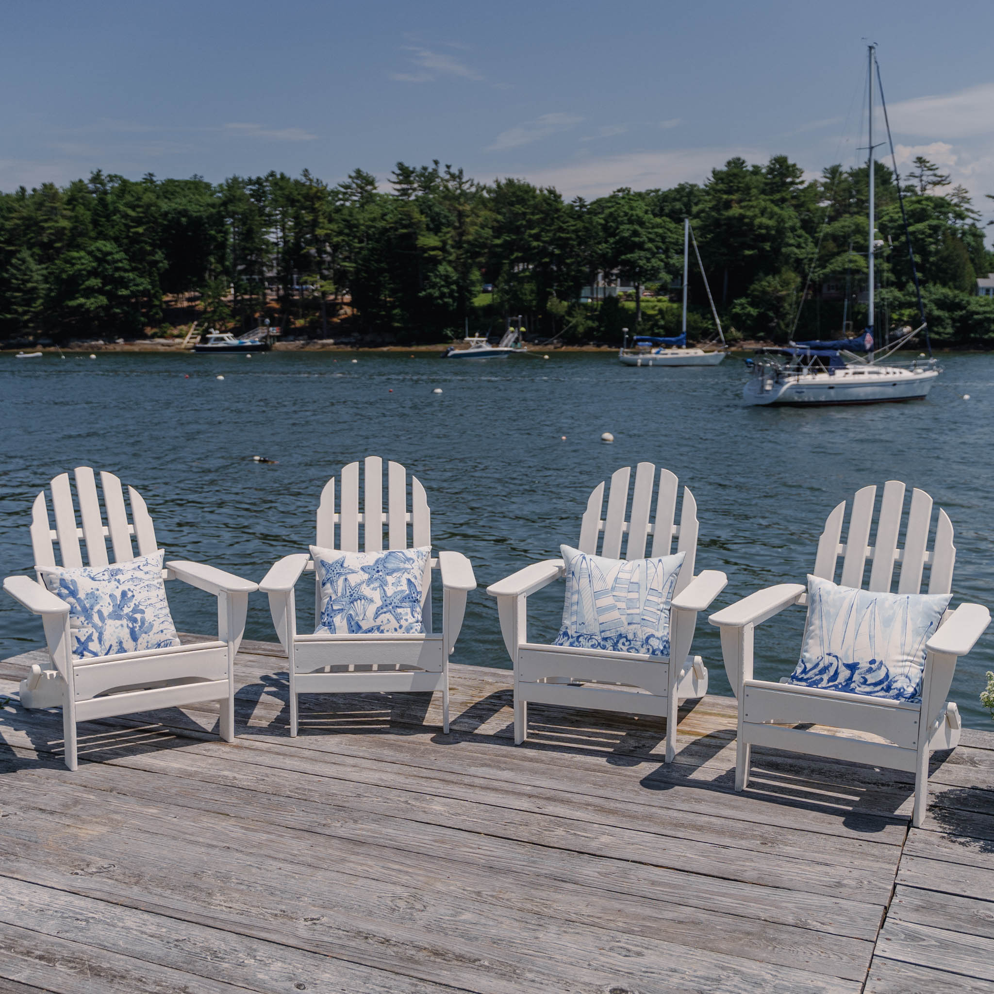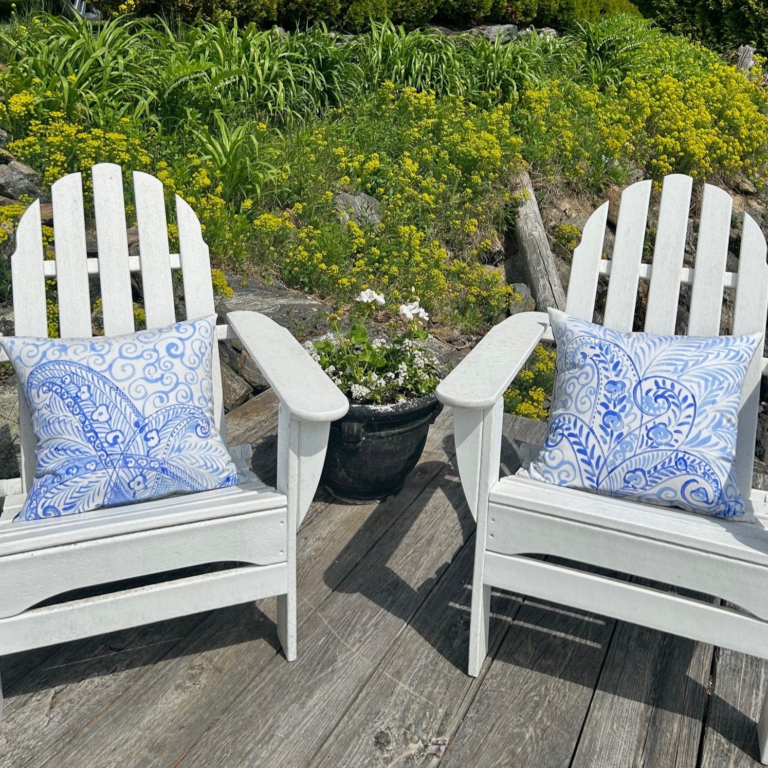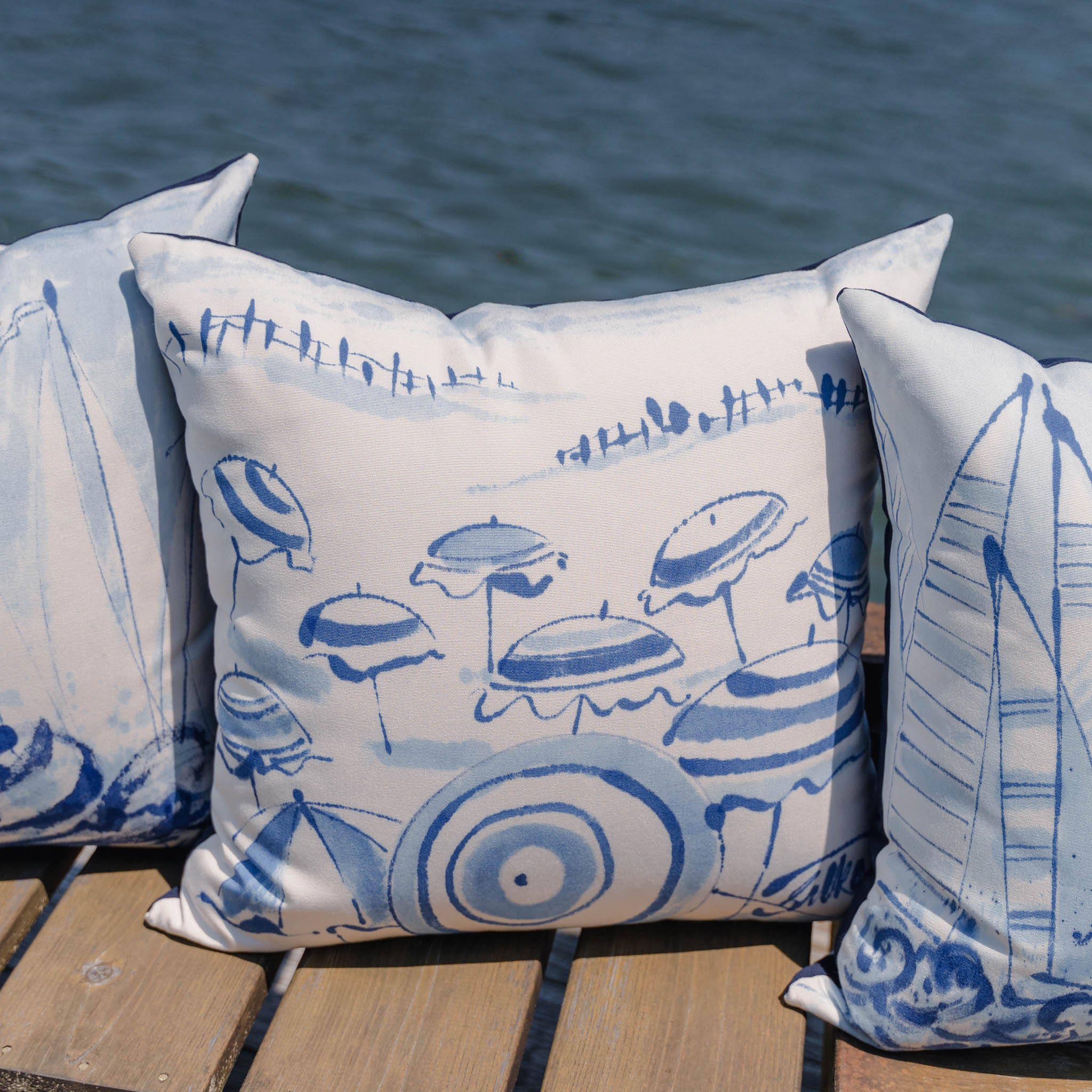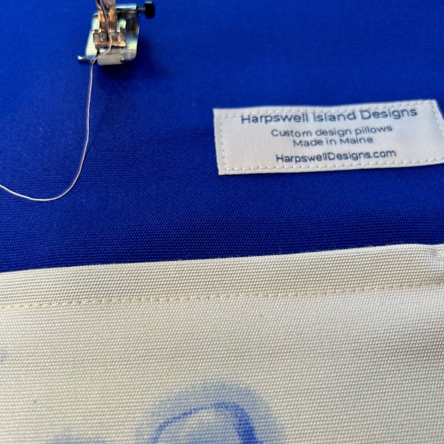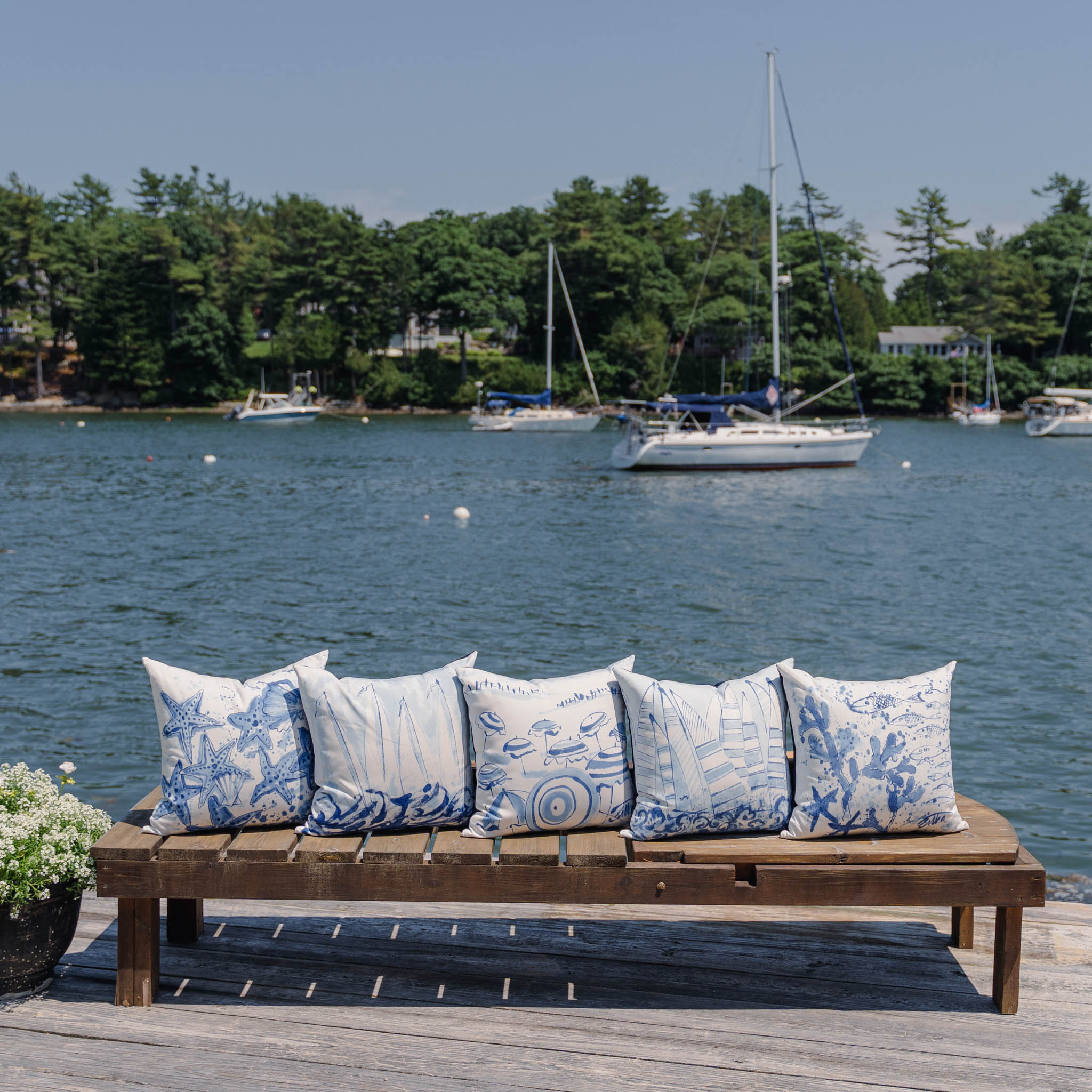Painted in Boston and sewn in Maine, this indoor/outdoor pillow is constructed with premium quality Sunbrella® fabric that is fade, stain, and weather resistant. Warm white front with a bright blue back. Add a touch of nautical style to your deck, patio, or boat with our luxuriously comfortable pillows.