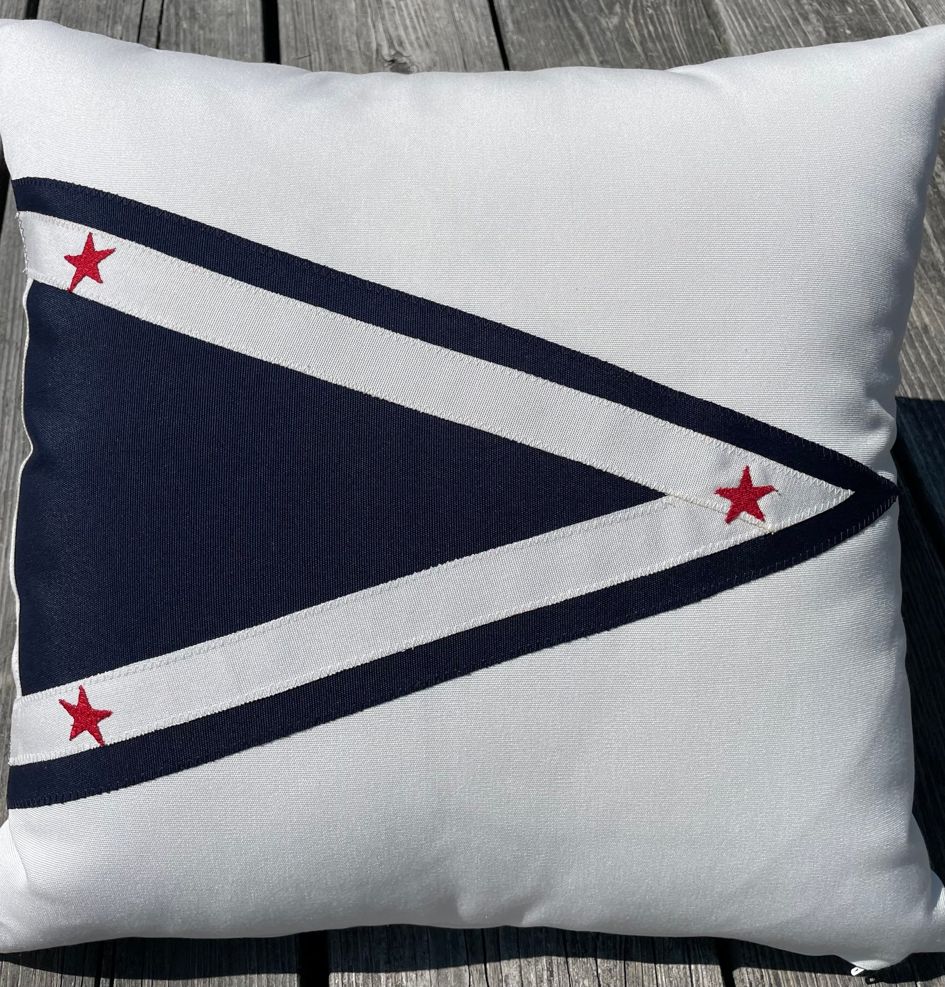 Made in Maine, this natural white pillow is constructed with premium quality Sunbrella® fabric that is fade, stain, and weather resistant. The design is appliquéd with a nautical zig-zag stitch for durability and design aesthetic. Add a touch of nautical style to your deck, patio, or boat with our luxuriously comfortable pillows.