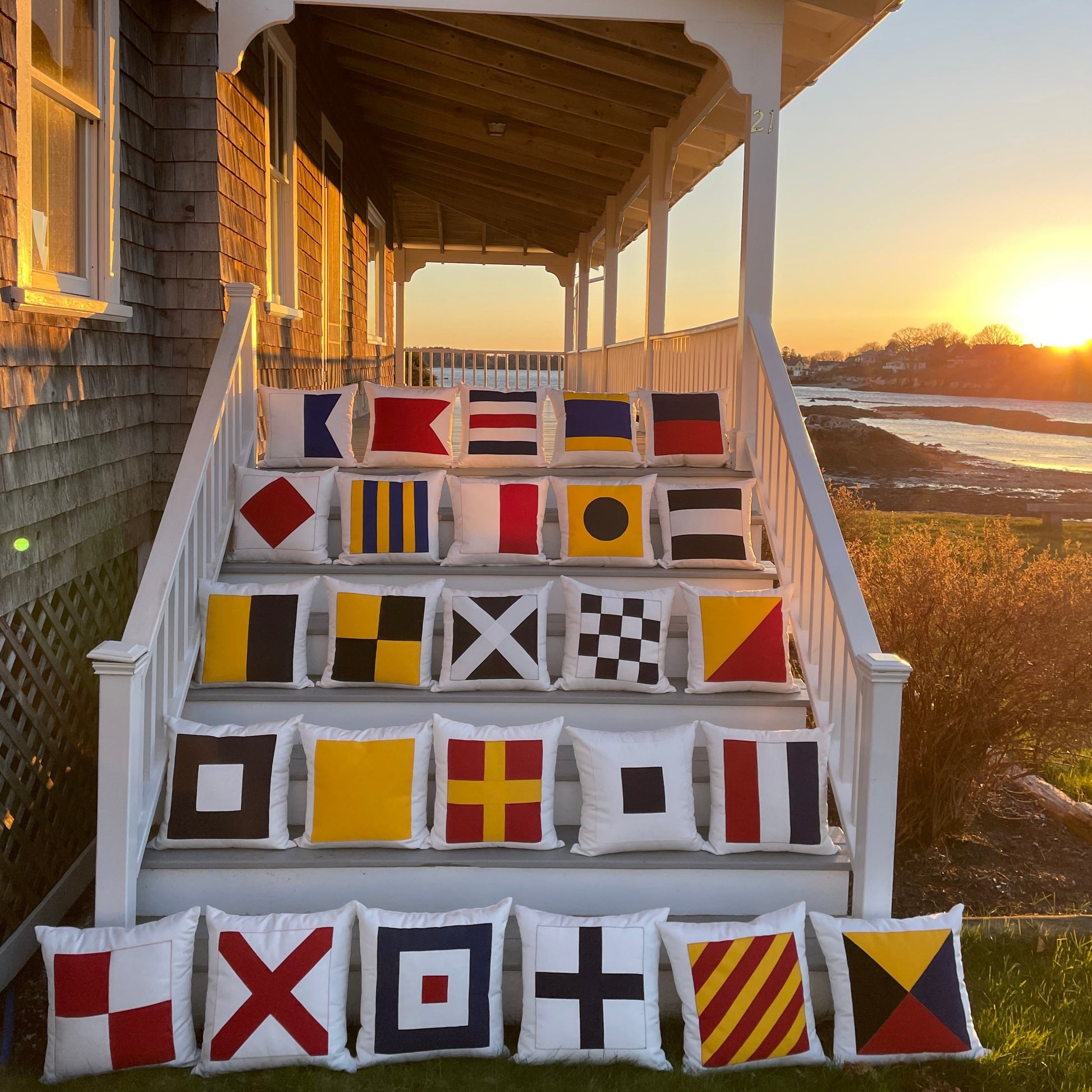 Code flags originated in the 1800's are used as an internationally understood system that includes 26 flags each depicting a letter of the alphabet. The primary colors of red, blue, yellow, black and white are used due to their vibrancy and ability to be distinguished at sea. Hoist your signal!
