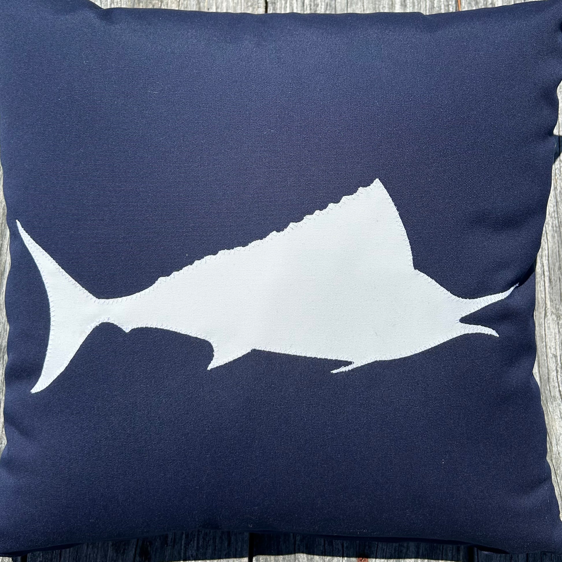Sailfish indoor/outdoor throw pillow. Made in Maine, this nautical navy pillow is constructed with premium quality Sunbrella® fabric that is fade, stain, and weather resistant. The design is appliquéd with a nautical zig-zag stitch for durability and design aesthetic. Add a touch of nautical style to your deck, patio, or boat with our luxuriously comfortable pillows.