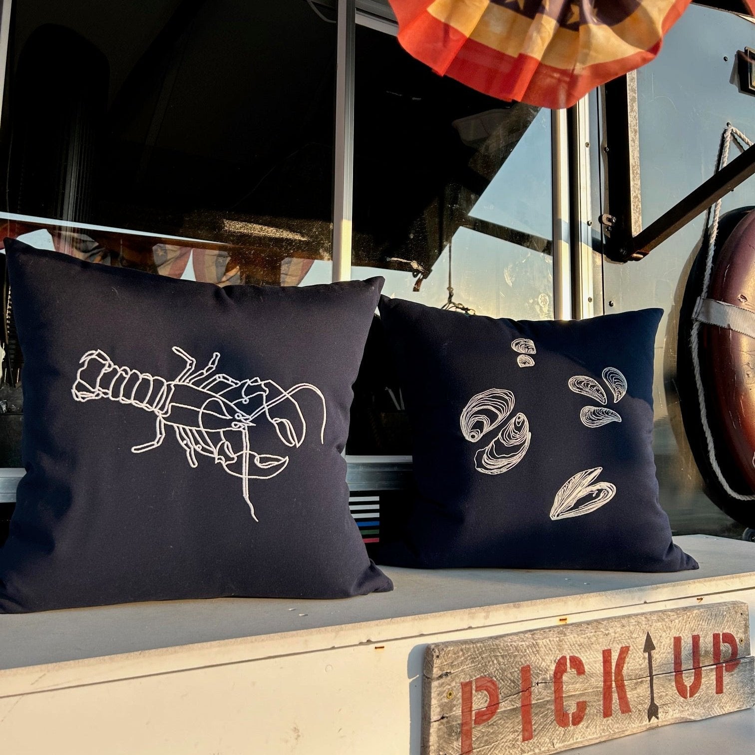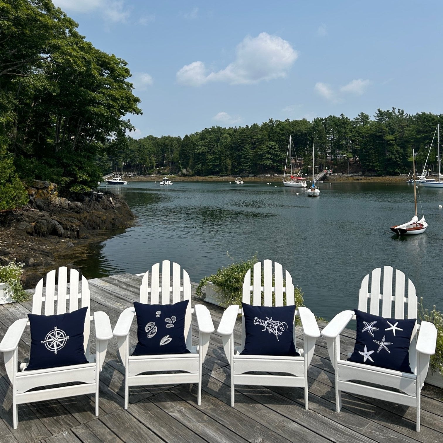 Sea Shells indoor/outdoor throw pillow. Made in Maine, this nautical navy pillow is constructed with premium quality Sunbrella® fabric that is fade, stain, and weather resistant. The design is embroidered for durability and design aesthetic. Add a touch of nautical style to your deck, patio, or boat with our luxuriously comfortable pillows.