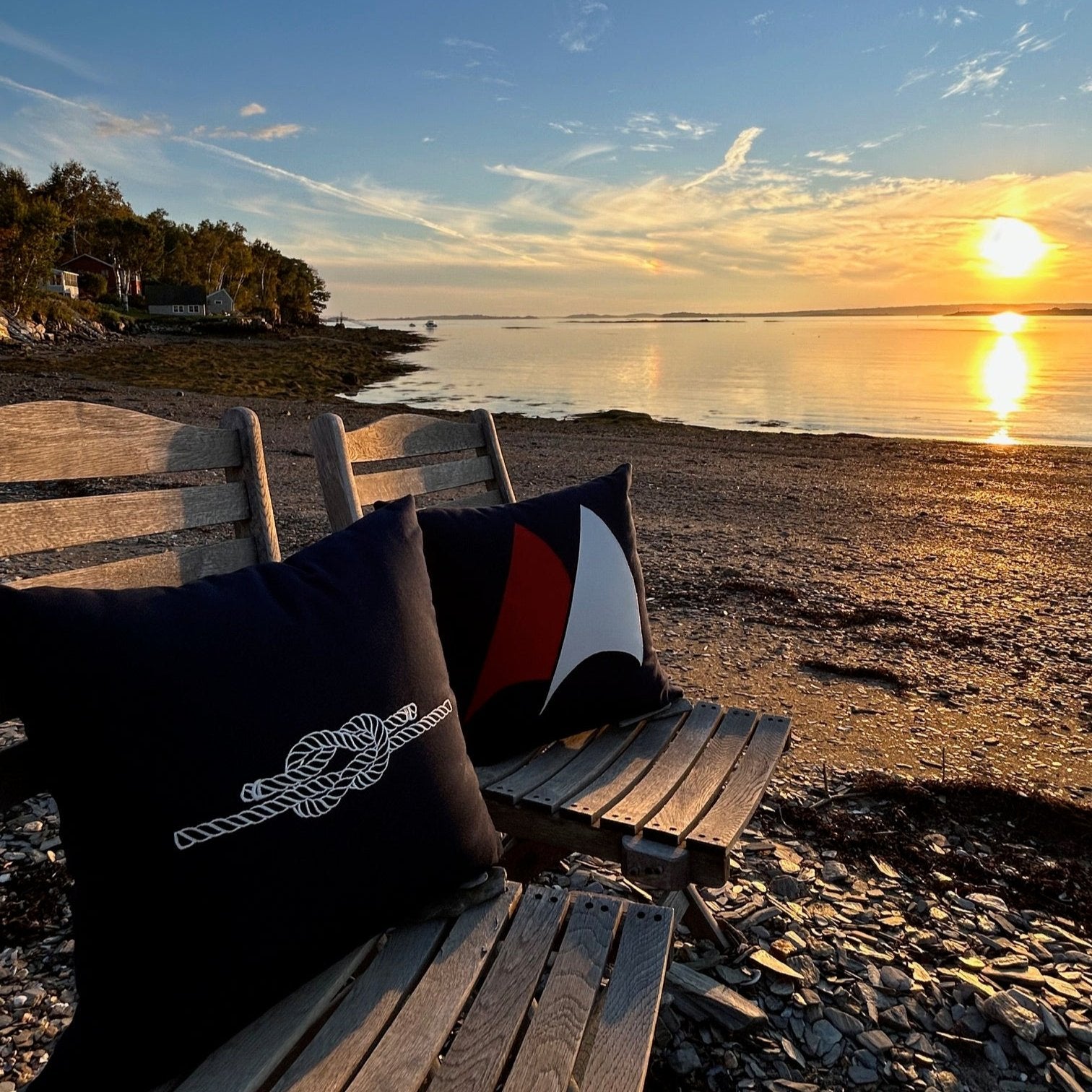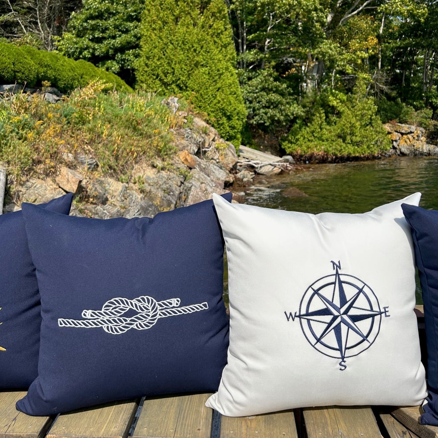 Square Knot indoor/outdoor throw pillow. Made in Maine, this nautical navy pillow is constructed with premium quality Sunbrella® fabric that is fade, stain, and weather resistant. The design is embroidered for durability and design aesthetic. Add a touch of nautical style to your deck, patio, or boat with our luxuriously comfortable pillows.