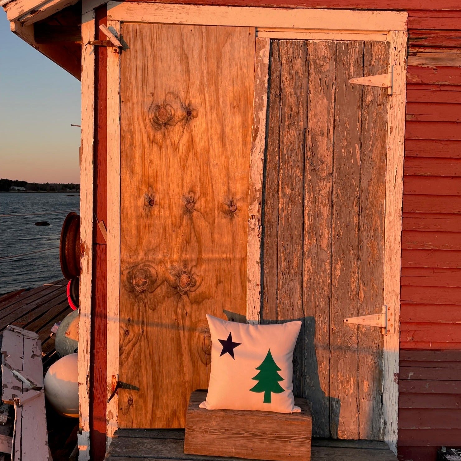 The official state of Maine flag adopted in 1901 which featured a green pine tree and a blue north star on a cream background. The pine tree, is a Native symbol of New England and freedom. This design was created by a marine committee interested in a state flag that would be recognizable from a distance at sea. Prideful Mainers have taken an interest in Maine's original flag, which has promoted the recent return and popularity.