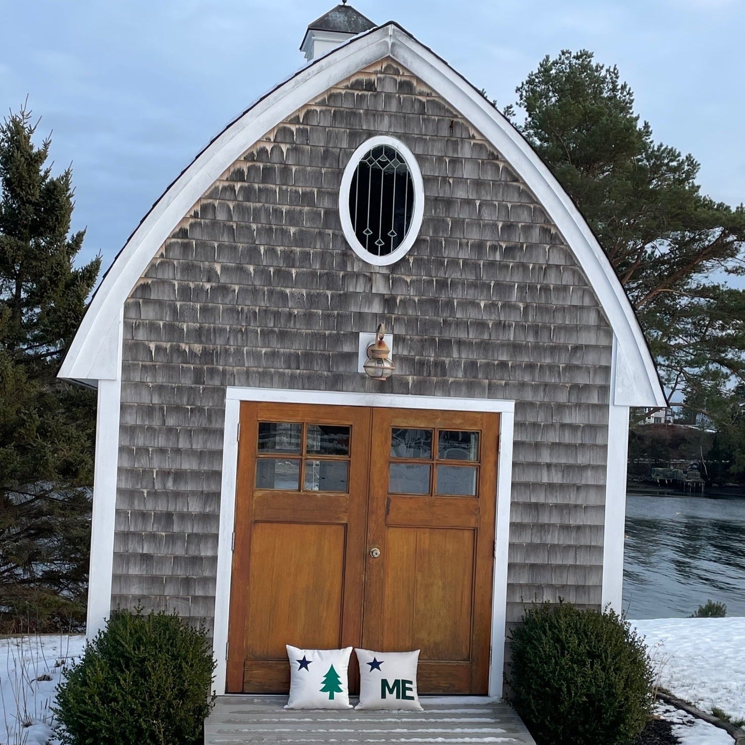 Indoor/outdoor throw pillow. Made in Maine, this natural white pillow is constructed with premium quality Sunbrella® fabric that is fade, stain, and weather resistant. The design is appliquéd with a nautical zig-zag stitch for durability and design aesthetic. Add some Maine State pride to your deck, patio, or boat with our luxuriously comfortable pillows.