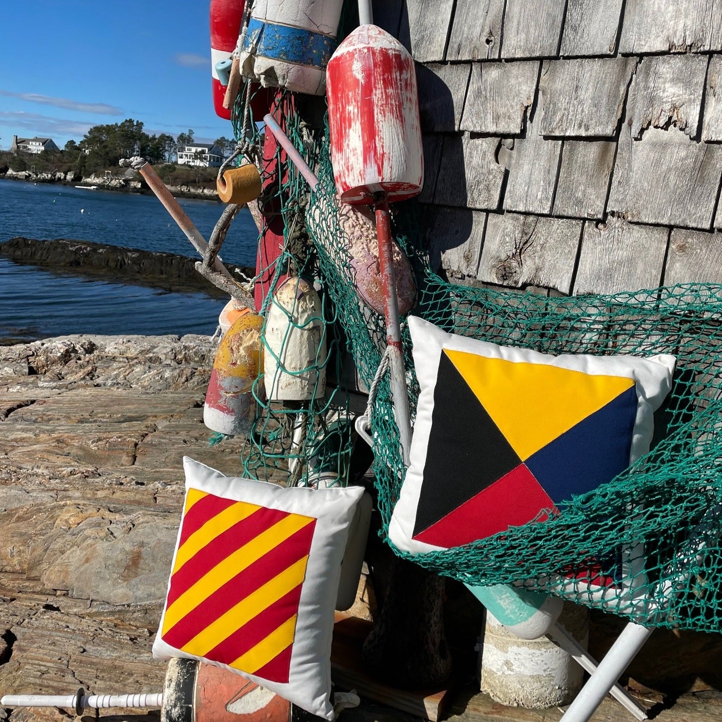 Code flags originated in the 1800's are used as an internationally understood system that includes 26 flags each depicting a letter of the alphabet. The primary colors of red, blue, yellow, black and white are used due to their vibrancy and ability to be distinguished at sea. Hoist your signal!